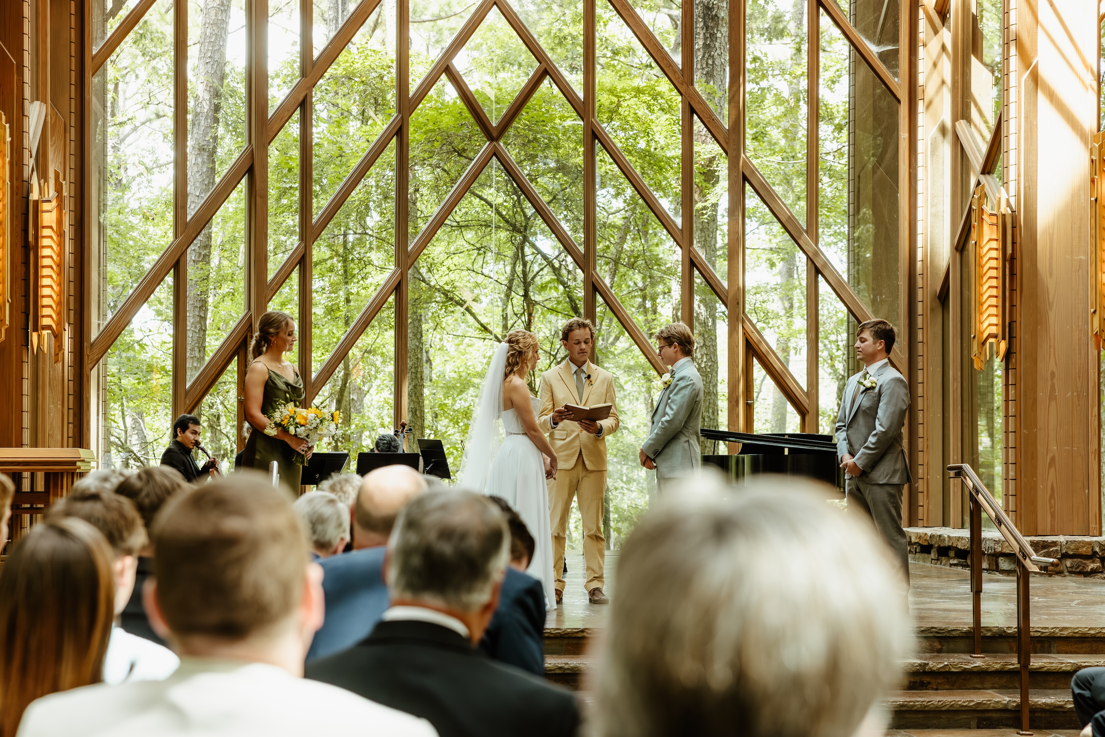 The ceremony took place in the stunning Anthony Chapel at Garvan Gardens, where floor-to-ceiling windows frame the natural beauty of the surrounding forest. Guests settled in for what they expected to be a traditional ceremony, surrounded by the chapel's soaring wooden beams and breathtaking views. Then came the first delightful surprise of the day: Elle's brother stepped forward as the officiant, catching everyone off guard and adding an incredibly personal touch to the proceedings. It was one of those perfect moments that reminded everyone this wasn't just any wedding. It was a celebration deeply rooted in family and connection.