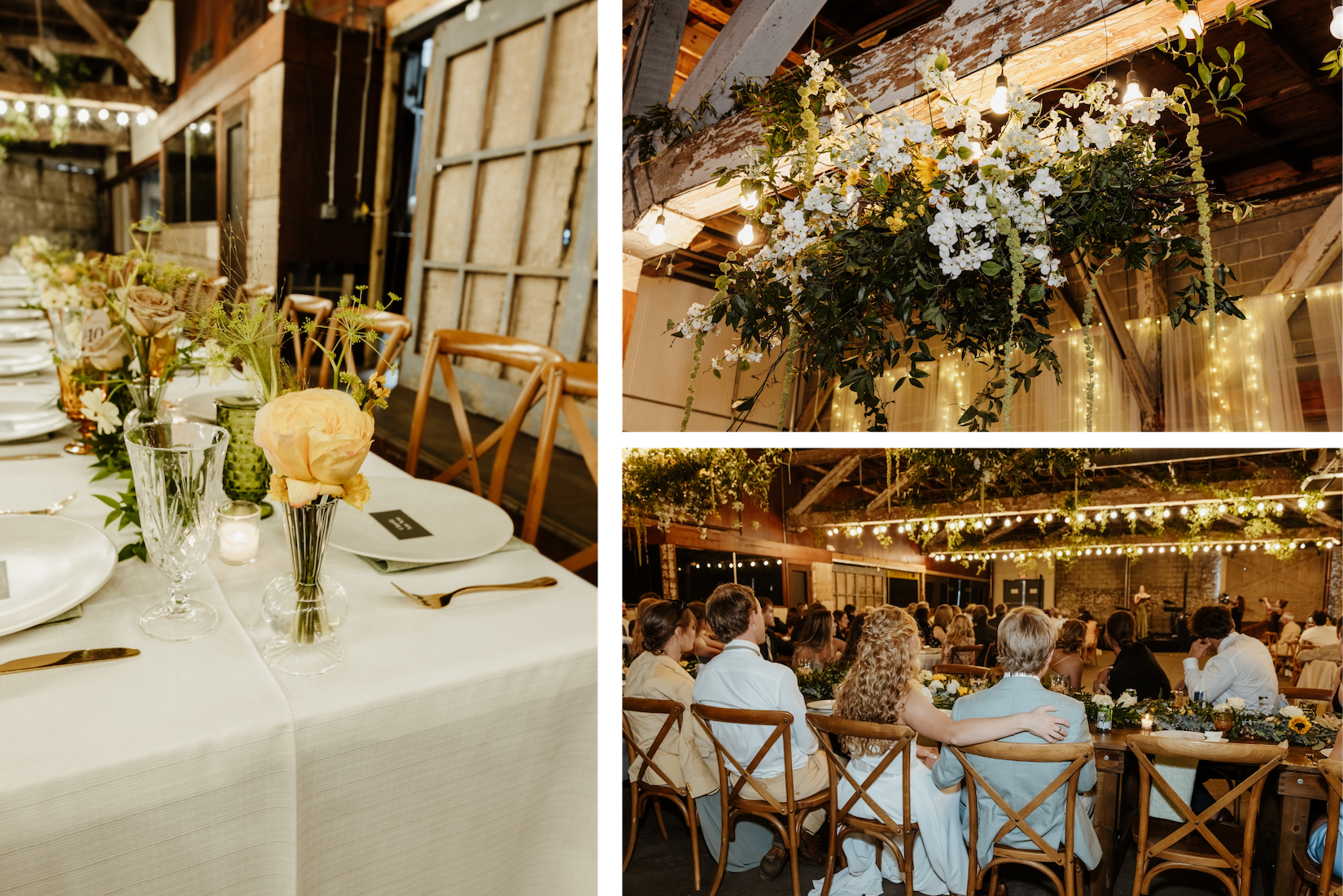 Following the ceremony, guests made their way to the Hamp Williams Building, where we transformed the space into an organic, garden-inspired dream. Greenery cascaded from and wrapped around the exposed beams overhead, while long baskets overflowing with flowers hung above an oversized head table that became the room's stunning focal point.